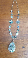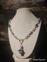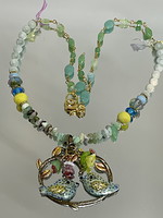 Components: Painted metallic pendant, Chrysoprase chips, gaea yellow chaplet, Lampwork beads, pale green moonstone beads, Czech flower dangles and chain. An infinity lobster clasp.