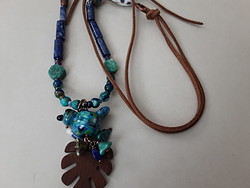 Components: Lampwork bird, Czech drinking glass, Lapis, Emerald, PC bead, copper tube, o chaplet, copper link and leather lace
