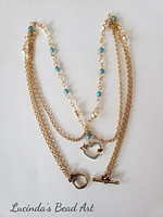 Components: LB Parawire Non Tarnish Gilt 20 Ga, 6 mm Cream Baroque Pearls, LB 4 mm CGFP Turquoise with Mercury finish, LB Satin Finish Turquoise Pave CZ Butterfly Eye, LB Hamilton Gold Plated Round wire cable Concatenation, Tierracast Britania Pewter Antique Gold Beaded two Loop Toggle 12 x 16 mm