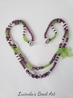 Components: Seed Chaplet xi/0 - Bound Green, Toho Gray Magenta Lined and LB Toho Ceylon Light Ivory, 4 mm Czech Glass Druks - Crystal, half-dozen x viii mm Czech Glass Purple Swirls, 5 mm Czech Glass Dark Amethyst Pressed Drinking glass Rondelles, 9 10 fifteen mm Peridot Drinking glass Birch Leaves, 16 x 19 mm Hammertone Magnetic Squeeze White Statuary Plated
