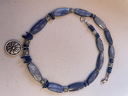 Components: Kyanite: elongated apartment ovals, rondelles and chips. Greek pewter lord's day spacers and lined spacers, Zola Element sun pendant.
