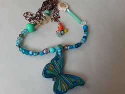 Components: Pc butterfly, Blue Agates, Lampworked flower chaplet, White Agate, green wooden stick dewdrop, Citrine, copper link, copper chain, vintage Millefiori peanut bead, Czech flowers.