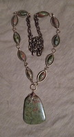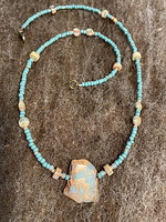 Components: Impression Jasper natural pendant, copper plated leaf charms, copper chain, antique copper clasp, seed beads.