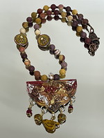 Components: The beautiful paw painted pendant with charms of red, gold Lamp work beads and a Czech glass yellow bird. The concatenation is Mookaite rounds with 2 bee bead. Antique copper lobster claw closure