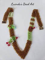 Components: Seed Beads viii/0 - Rootbeer, Seed Beads eleven/0 - Jump Green, 6 x iv mm Czech Drinking glass Rice Beads - Peridot, LB 2 10 five mm Czech Drinking glass Opaque Bali Style Daisy Spacers, 3 ten viii mm Czech Glass Daisy Spacers - Ruby, six x 8 mm Czech Glass Bellflower - Siam, 2 ten 5 mm Daisy Spacer - Aqua, thirteen x 17 Tierracast Magnetic Antique Gold Plate Temple Stitch Clasp