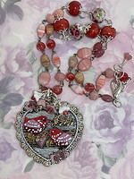 Components: Heart pendant with necklace made from Czech drinking glass, cerise gaea beads, and Lamp work beads. Some Czech drinking glass dangles and argent plated findings.