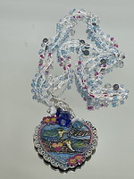Components: Painted metal pendant, Czech drinking glass bloom dangles. I made a beaded crochet necklace using seed beads, crystals, and #x crochet thread.