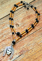 Components: Black chain, jump rings, Irish linen, leather and assorted lamp work caput pins.