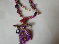 Components: Contumely log, Czech bird, sari silk, Ruby Crazy Lace Agate, gold spacers, unknown rock, golden chain, Hematite and gilded toggle