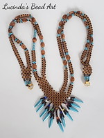 Components: Seed Beads eleven/0 - Toho Rainbow Frost Dark Topaz, Opaque Aqua Blue, LB Toho Frosted Metallic Dark Bronze, 6 x 8 mm Czech Glass Dark-brown Smooth Flat Oval with Specks, 4 x 16 mm Czech Glass Thorns - Pearl Matte Aqua, LB iv mm Czech Drinking glass Fire Polished Turquoise with Mercury Finish, 3 mm Cats eye Beads - many colors, LB 9 10 18 mm Tierracast Hammertone Magnetic Clasp Gilded Plated